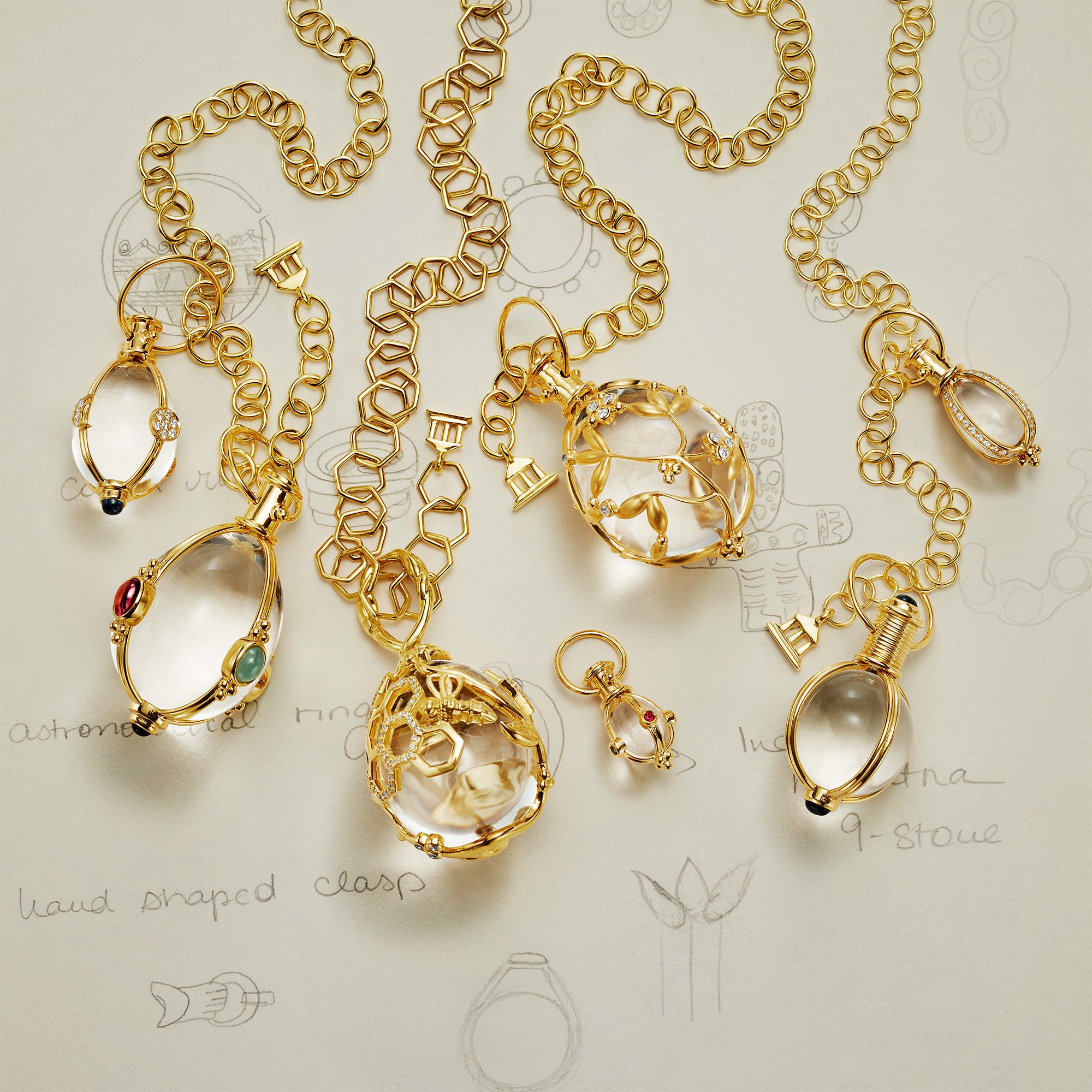 A raconteur, artist, and jeweler, St. Clair explores the cultural and anthropological significance of charms and amulets. Her iconic Rock Crystal Amulets, inspired by medieval talismans, reflect a scholarly yet imaginative approach, positioning jewelry as a medium of individual expression and as an intimate exchange between the object and wearer.