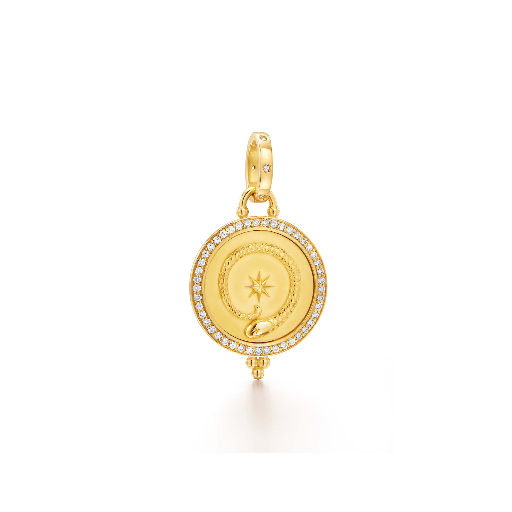 On the 18K Diamond Terra Pendant a mythical, golden serpent winds its way around the universe. A symbol of eternity, this meaningful pendant features many layers of detail, from its central star and hand-engraved serpent, to the intricate detailing on the back and halo of diamonds. The 18K Diamond Terra Pendant showcases the mastery of our Florentine goldsmiths.