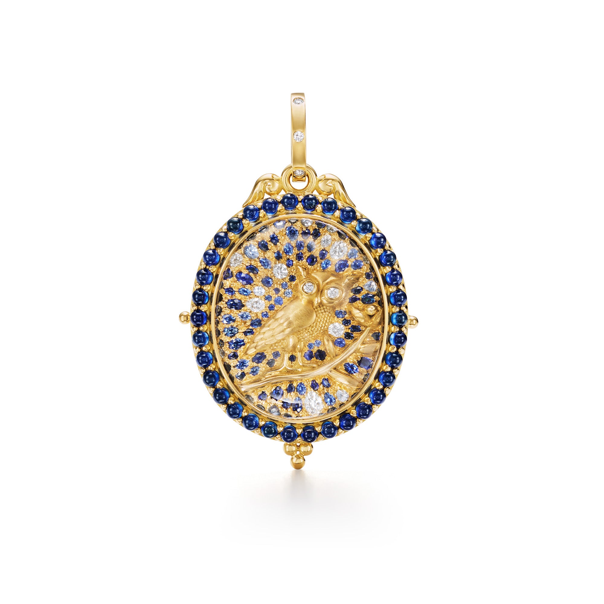 The 18K Blue Sapphire Nocturne Owl Locket is a jewel of quiet power and layered beauty. A golden owl perches on a sculpted branch beneath carved, polished rock crystal, set against a deep sky of rich blue sapphires. Encircled by a halo of blue sapphire, this luminous scene evokes the mystery of dusk and the wisdom that emerges with nightfall.