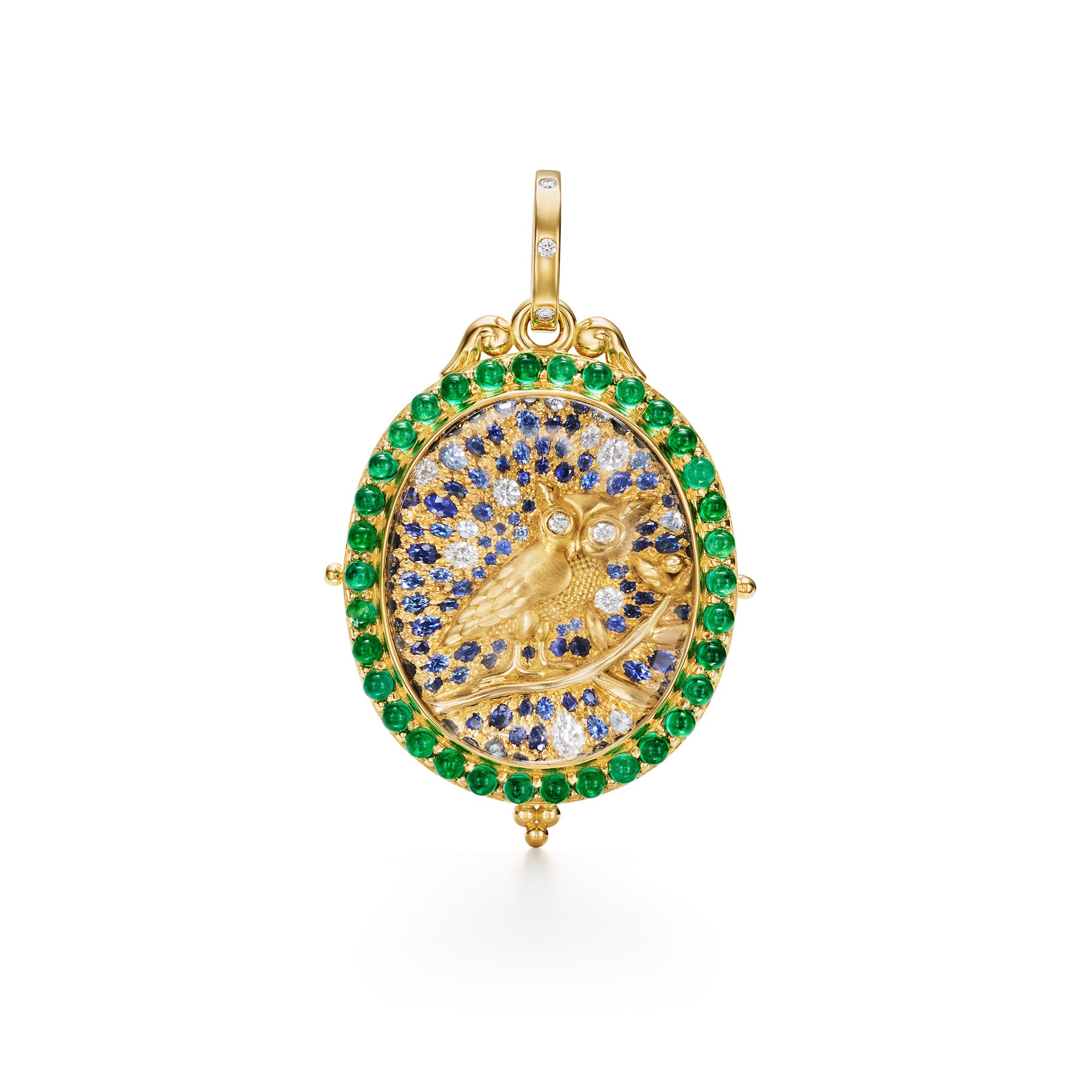 The 18K Emerald Nocturne Owl Locket is a jewel of quiet power and layered beauty. A golden owl perches on a sculpted branch beneath carved, polished rock crystal, set against a deep sky of rich blue sapphires. Encircled by a halo of emerald, this luminous scene evokes the mystery of dusk and the wisdom that emerges with nightfall.