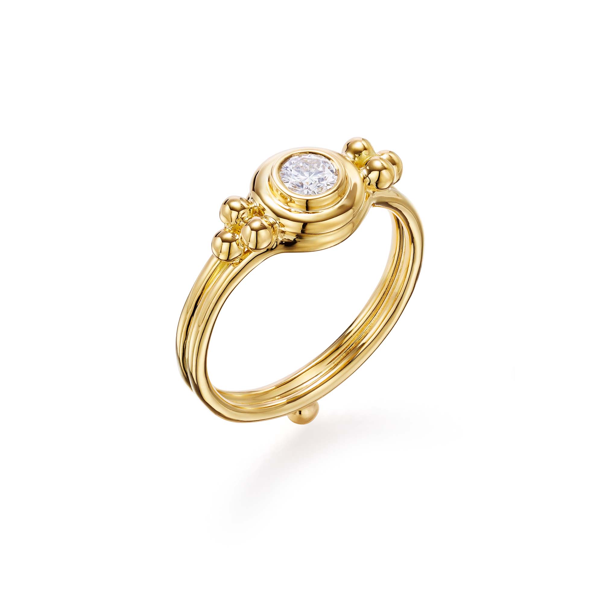 The 18K Temple Diamond Ring, 0.25ct finds a diamond flanked by our iconic trio motif and set in our signature yellow gold.
