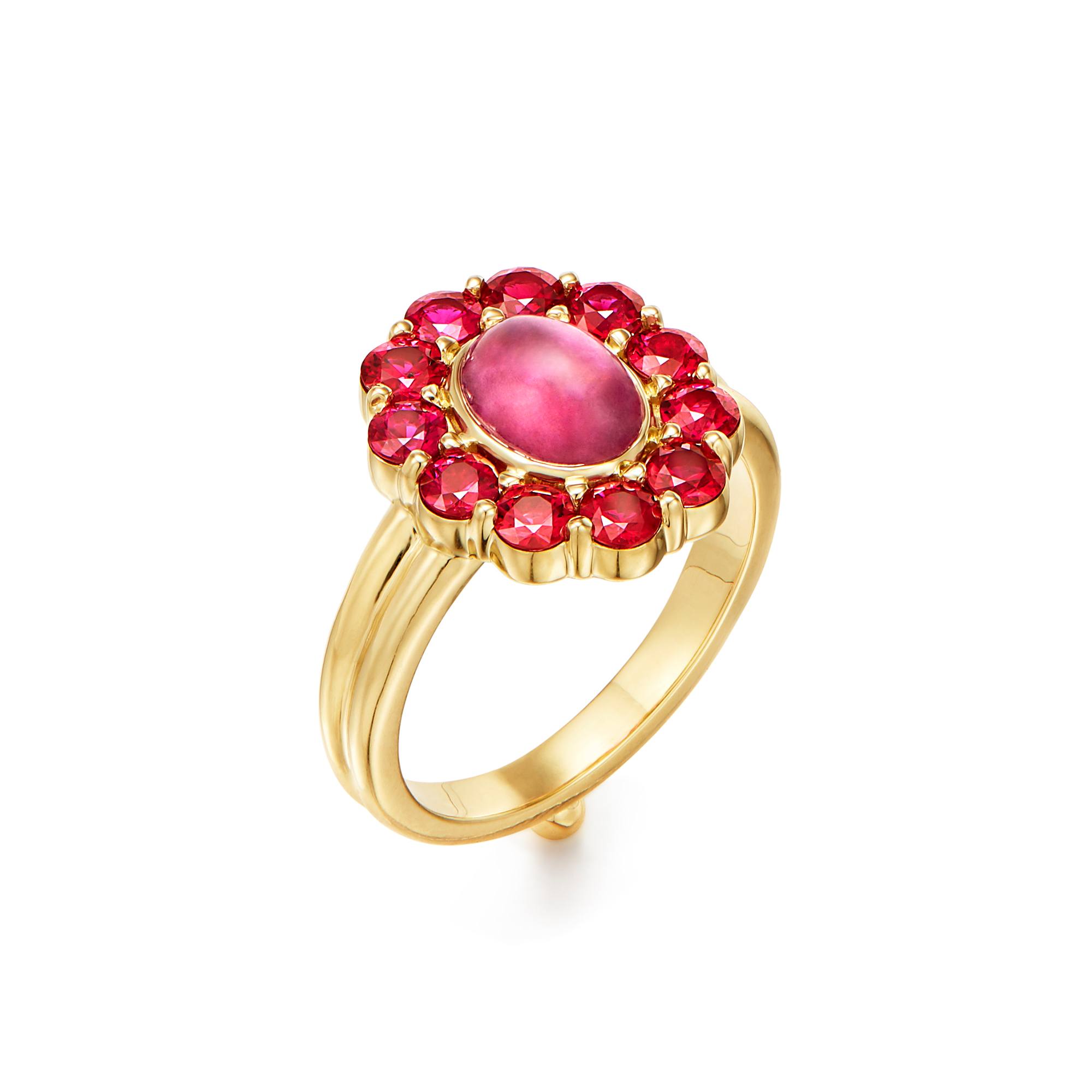 The 18K Pink Tourmaline Color Theory Ring is an ode to red. A fiery circle of faceted rubies frame a hot pink cabochon tourmaline, highlighting the color’s every glowing shade. Our signature gold granulation gives this ring a luxe finish.