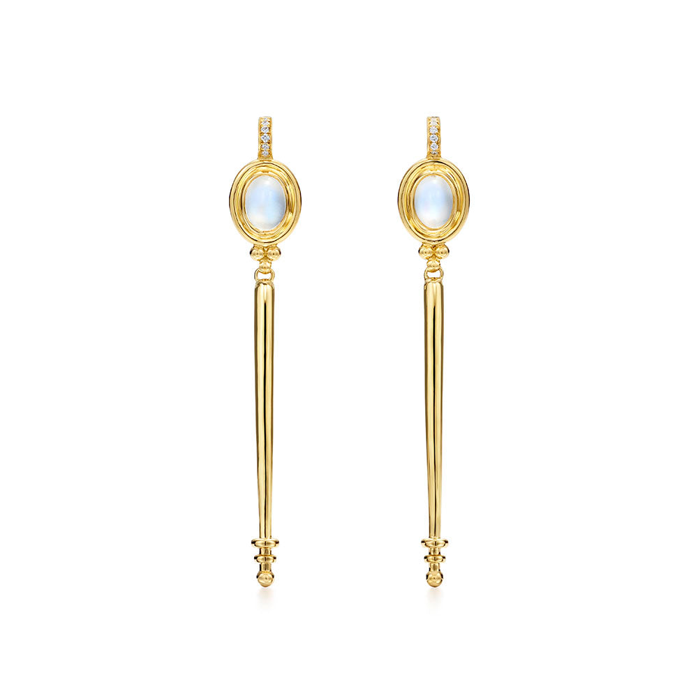 The 18K Classic Temple Baton Earrings combine luminous Blue Moonstones, brilliant diamonds, and our signature yellow gold in a single treasure. Designed to be dynamic, the regal batons move with you.