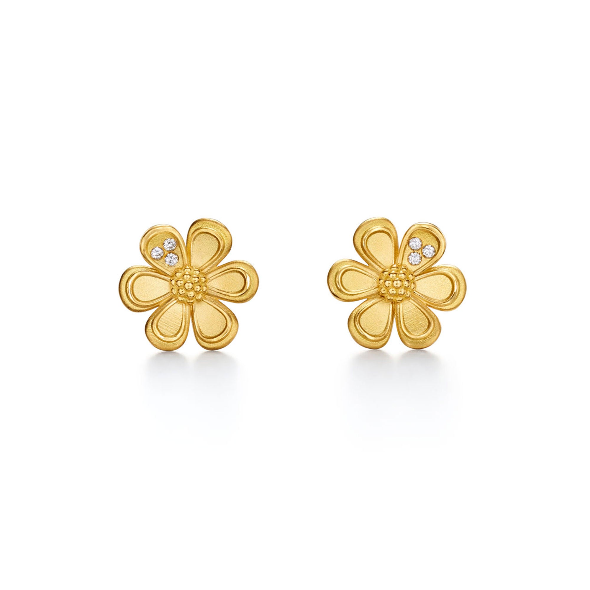 On the 18K Golden Flower Post Earrings, our signature yellow gold has been elegantly crafted into the shape of open blossoms. They are accented with diamonds.