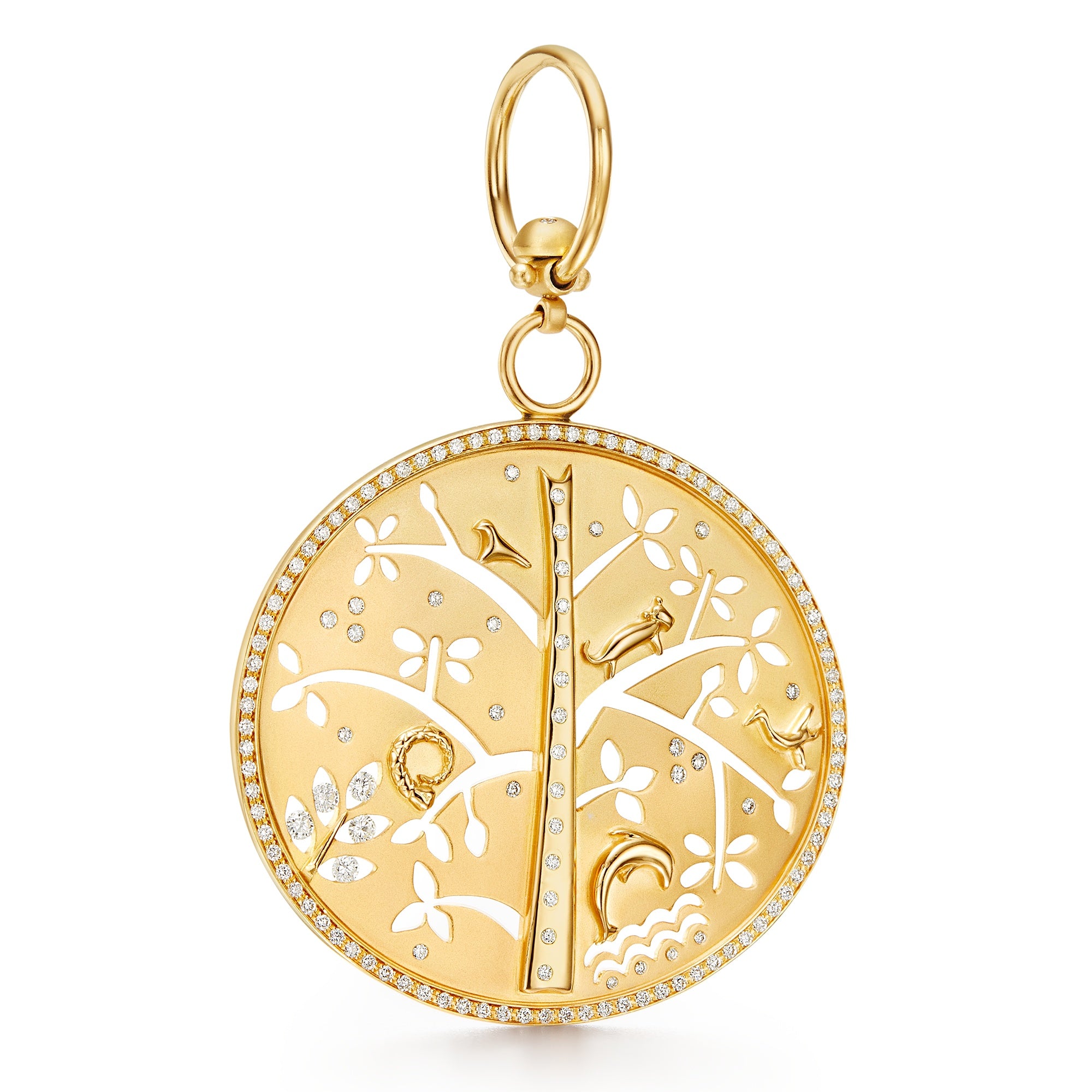 The 18K Large Tree of Life Pendant is the centerpiece of the Tree of Life Collection, celebrating all creatures that roam the land, air, and sea. Here, golden animals play among the branches and in the water below. A ring of pavé diamonds encircles the scene. Turn the 18K Tree of Life Pendant into your own family tree by engraving names along the branches. Customized hand engraving is available to add names, initials, or a special message to this jewel.