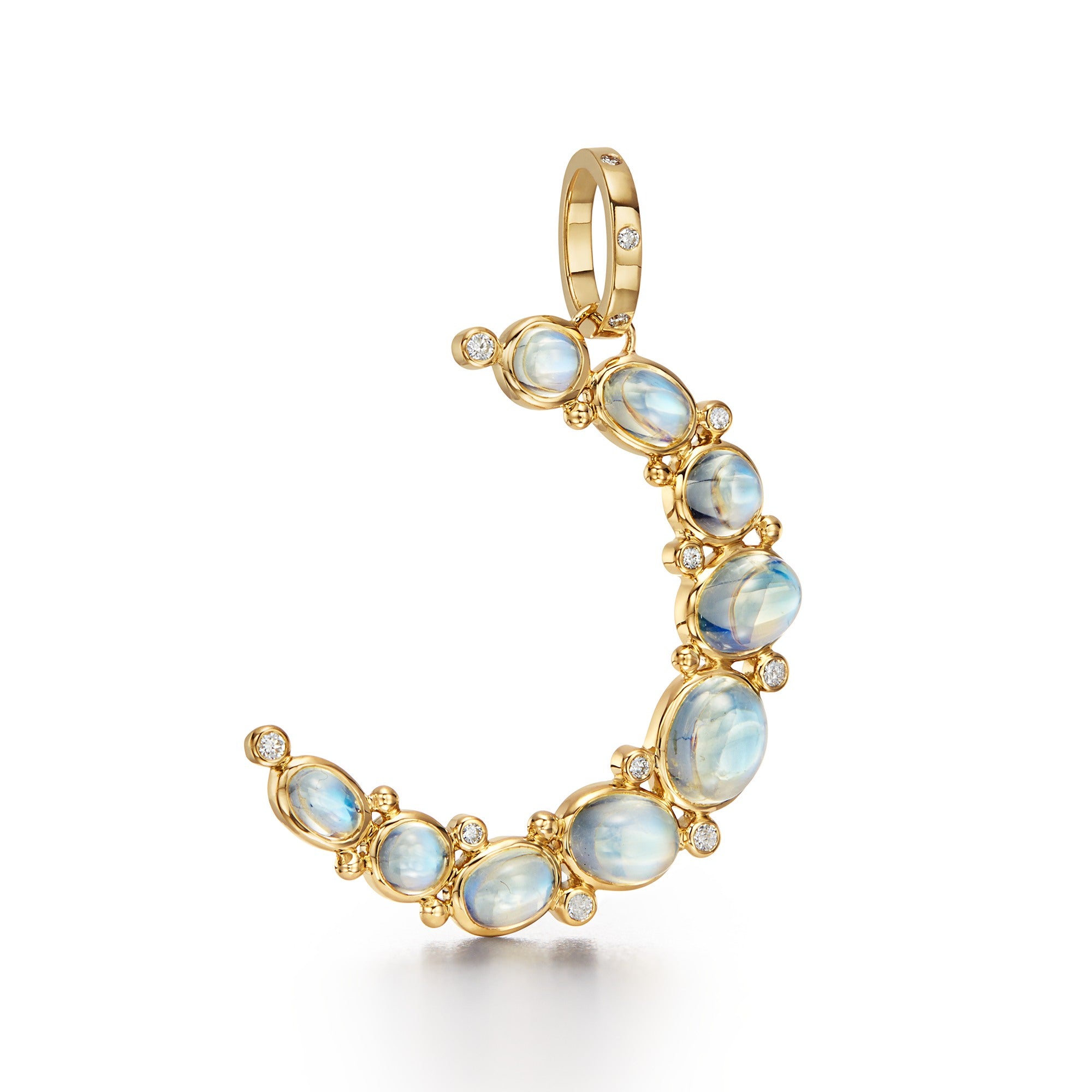 The 18K Large Crescent Moon Pendant is inspired by the night sky. Blue Moonstones and diamonds give this piece an effortless, luminous energy.
