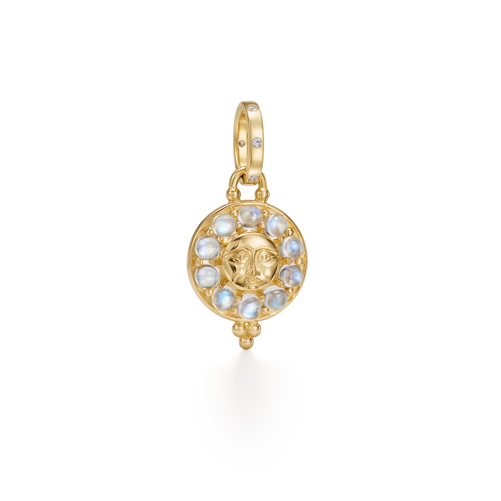 The 18K Selena Pendant glows with quiet radiance. Named for the goddess of the moon, this serene celestial face—part sun, part moon—is framed by a halo of cabochon blue moonstone. A jewel of balance and luminous grace.