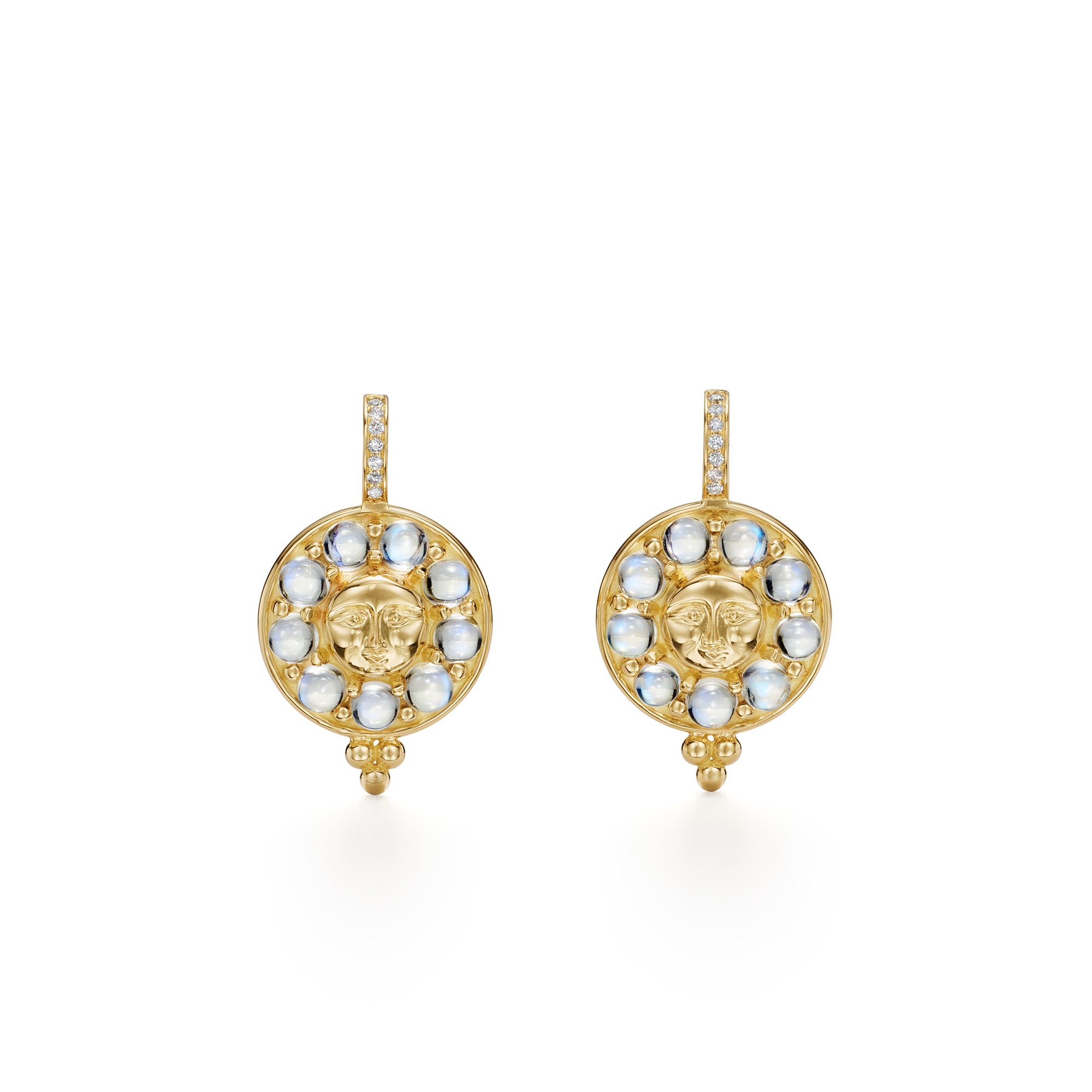 The 18K Selena Luna Earrings glow with quiet radiance. Named for the goddess of the moon, each serene celestial face—part sun, part moon—is framed by a halo of cabochon blue moonstone. Worn together, a luminous expression of balance and grace.