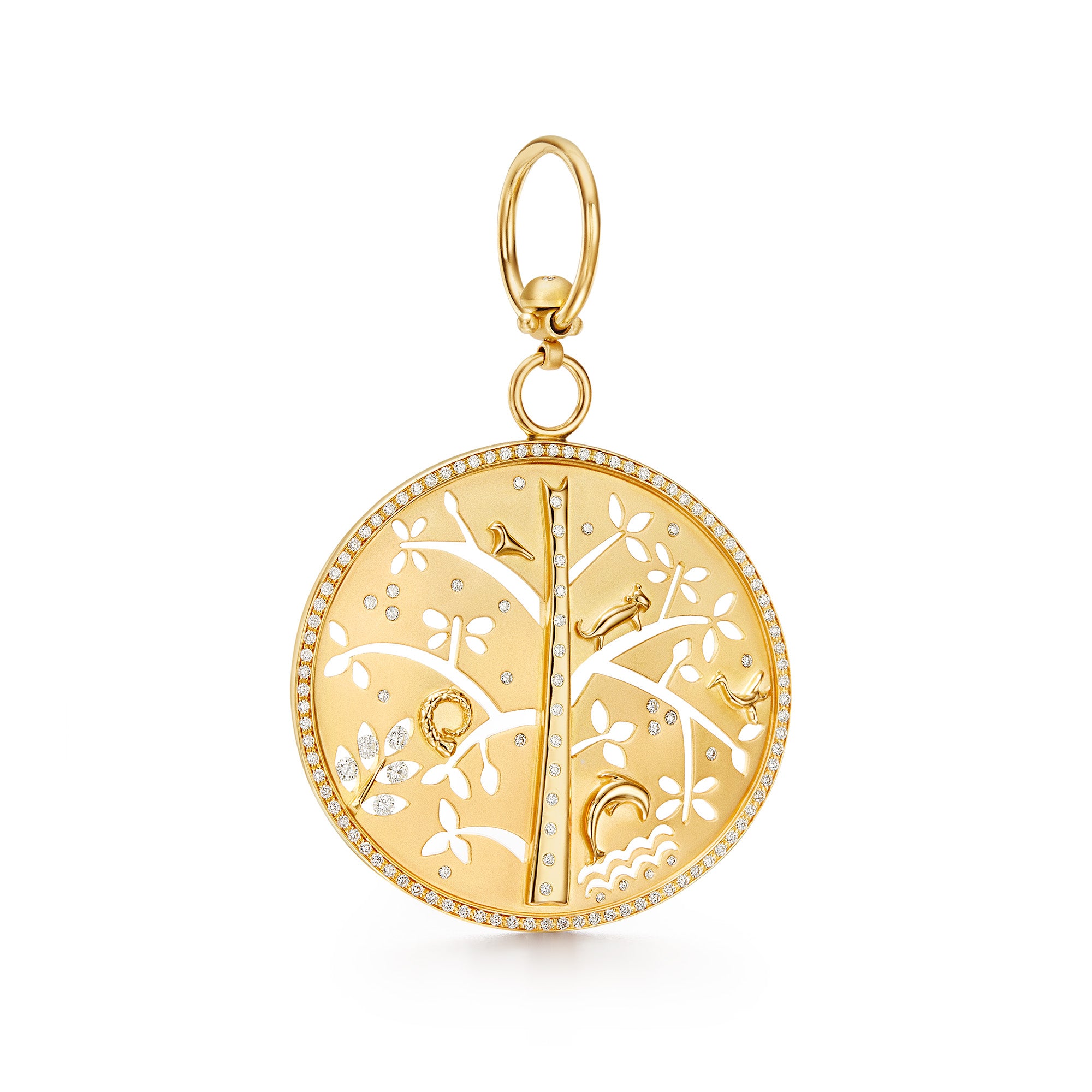 The 18K Large Tree of Life Pendant is the centerpiece of the Tree of Life Collection, celebrating all creatures that roam the land, air, and sea. Here, golden animals play among the branches and in the water below. A ring of pavé diamonds encircles the scene. Turn the 18K Tree of Life Pendant into your own family tree by engraving names along the branches. Customized hand engraving is available to add names, initials, or a special message to this jewel.