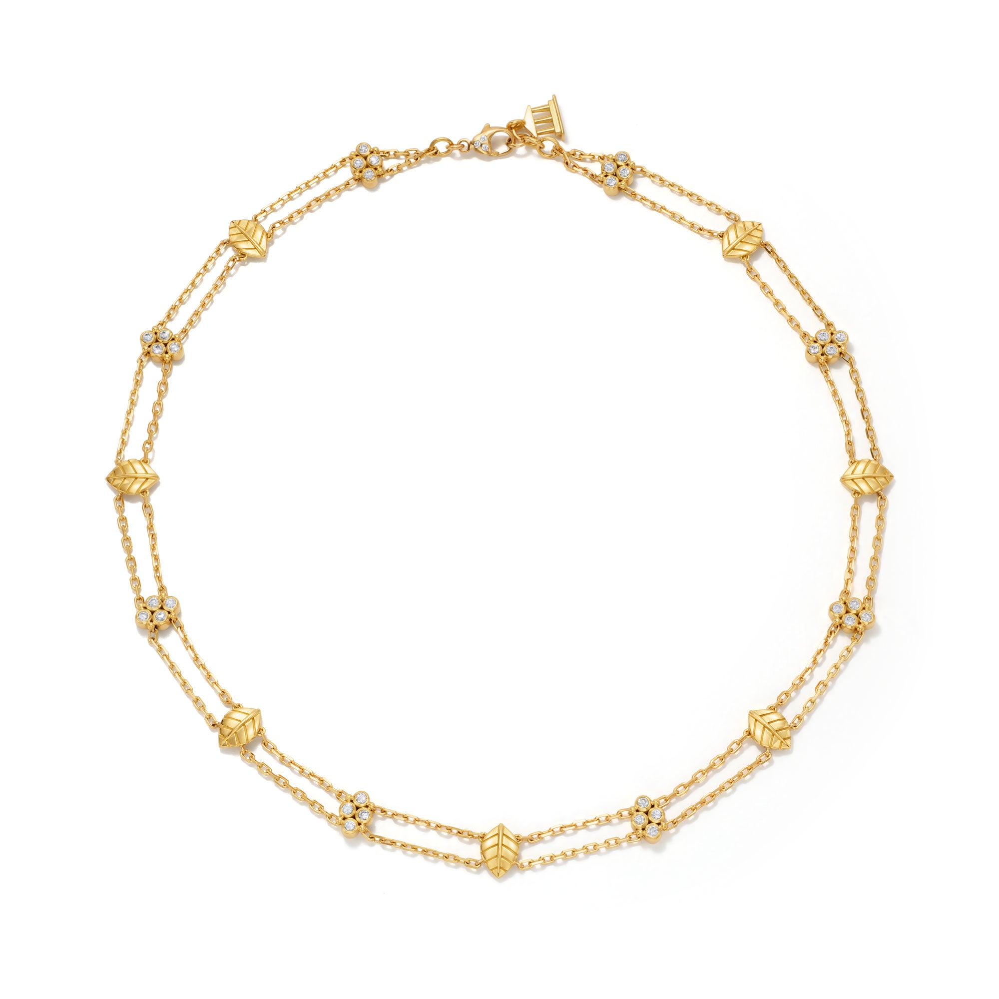 Perfect for any mythical situation you may find yourself in, the elegant 18K Arcadia Necklace is composed of two delicate golden chains that hold a series of engraved leaves and our signature diamond trios between them.