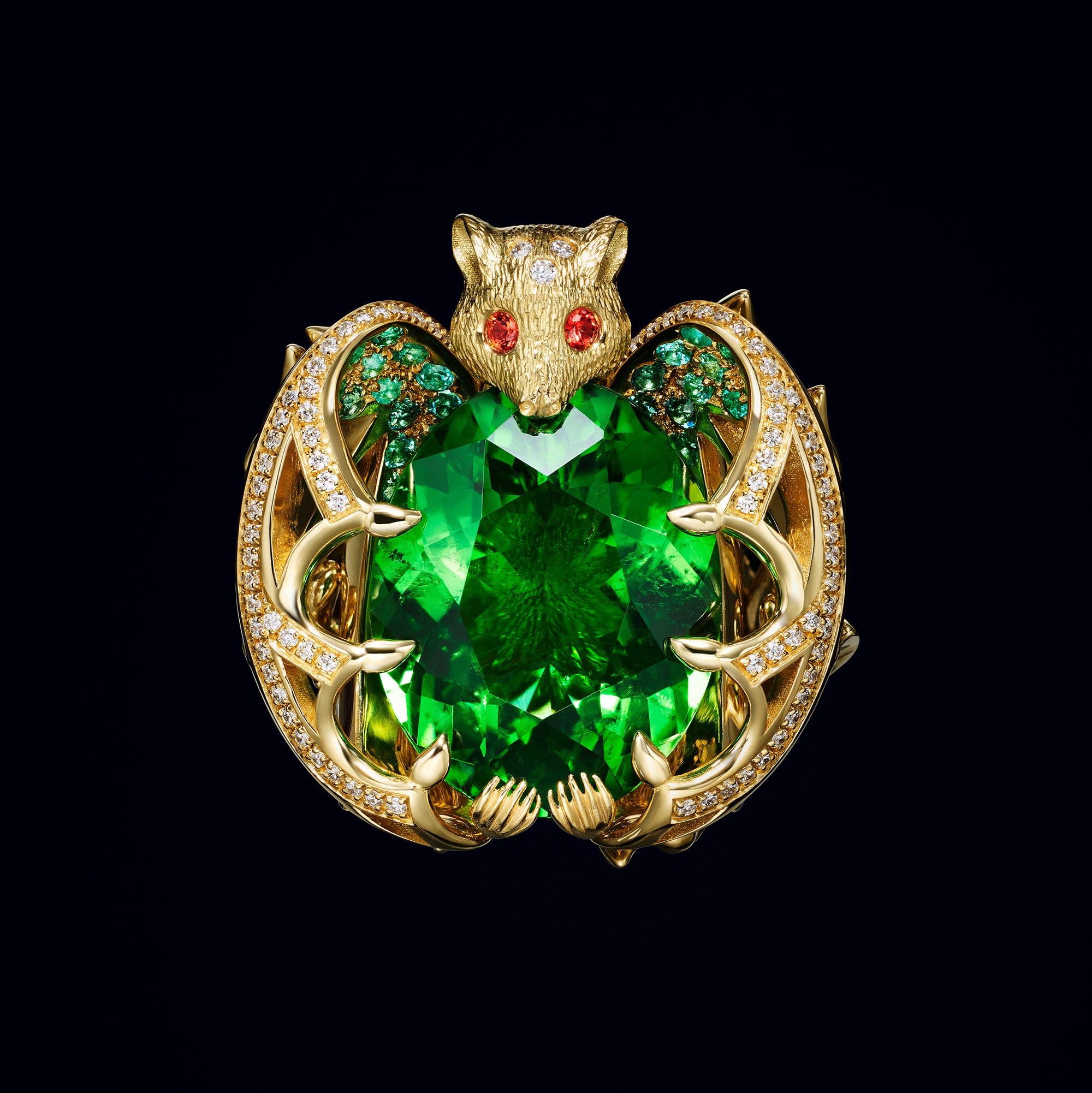 Handcrafted in Florence by master goldsmiths, the 18K Bat Ring is a jeweled study in duality, where beauty meets fear and myth meets nature. Centered on a luminous chrome tourmaline fruit (13.43 ct), framed by Paraíba tourmaline (1.024 ct) and orange sapphire (0.08 ct), the ring captures a fruit bat mid-feast, its wings unfurled in sculpted gold.