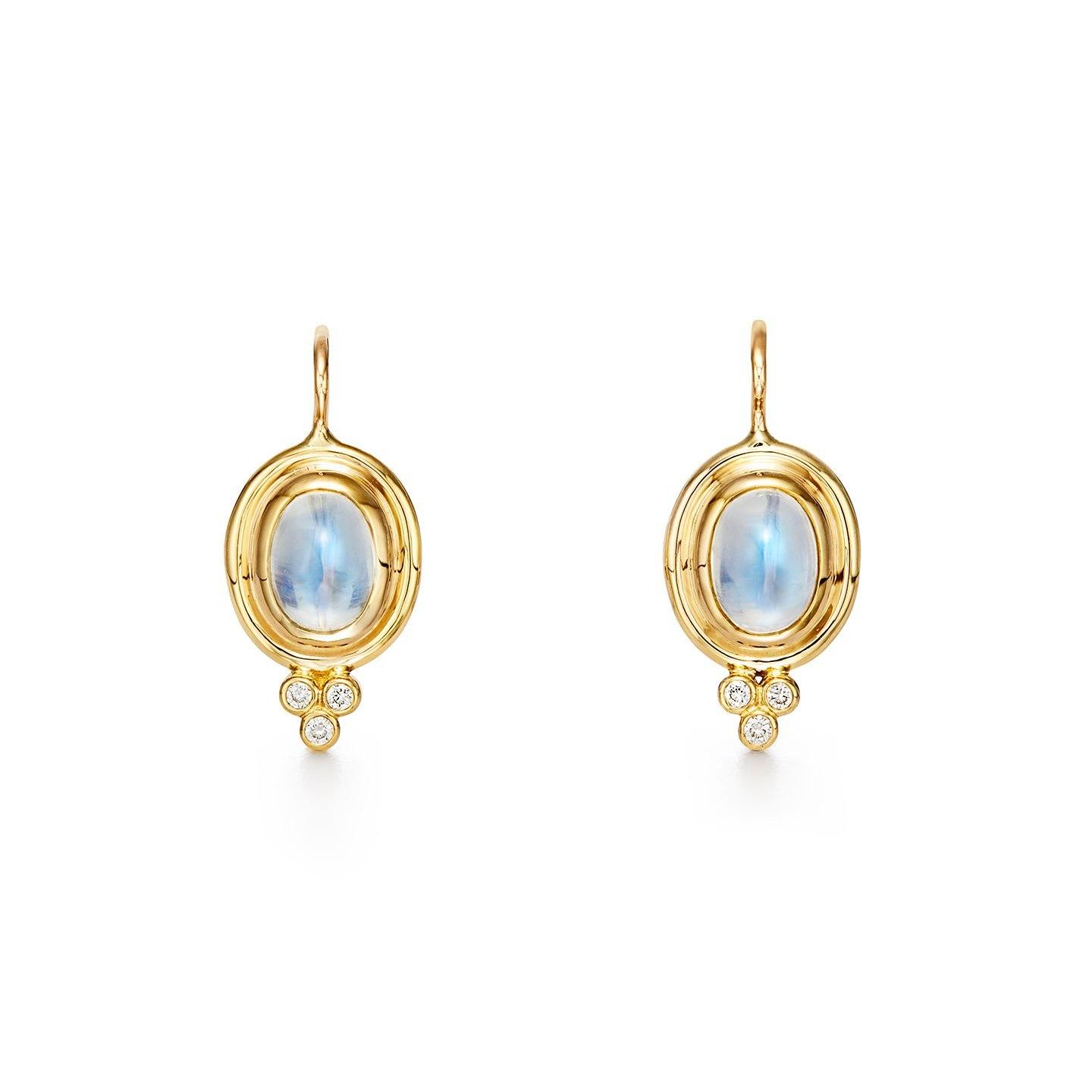 The 18K Classic Temple Earrings set our iconic stone, the Blue Moonstone, in one of our favorite Temple St Clair silhouettes. Inspired by the Byzantine mosaics of Ravenna, the 18K Classic Temple Earrings are finished with our signature trio of diamonds.