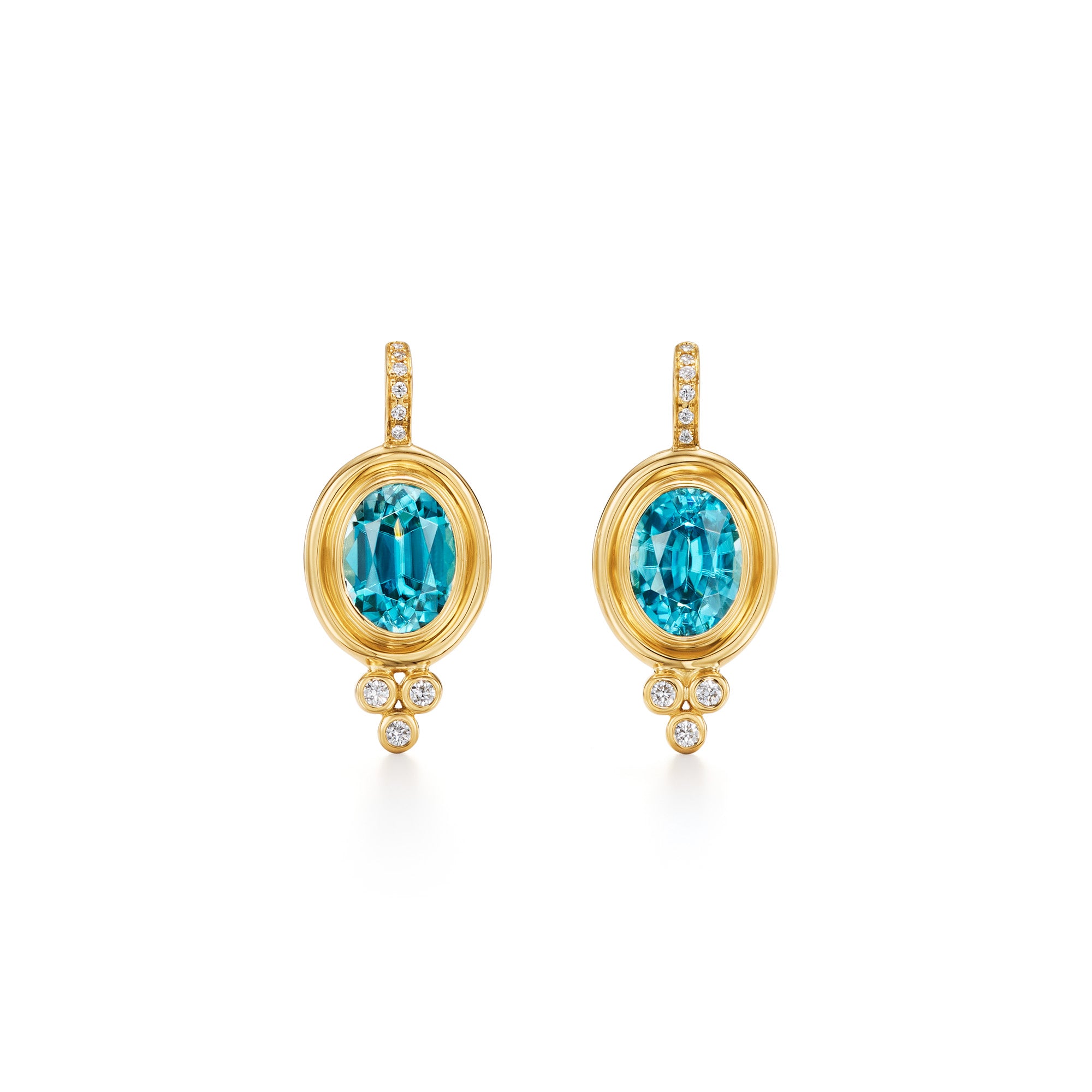The 18K Blue Zircon Classic Temple Earrings set Zircon’s blue hues in one of our favorite Temple St Clair silhouettes. Inspired by the Byzantine mosaics of Ravenna, the 18K Classic Temple Earrings are finished with our signature trio of diamonds.