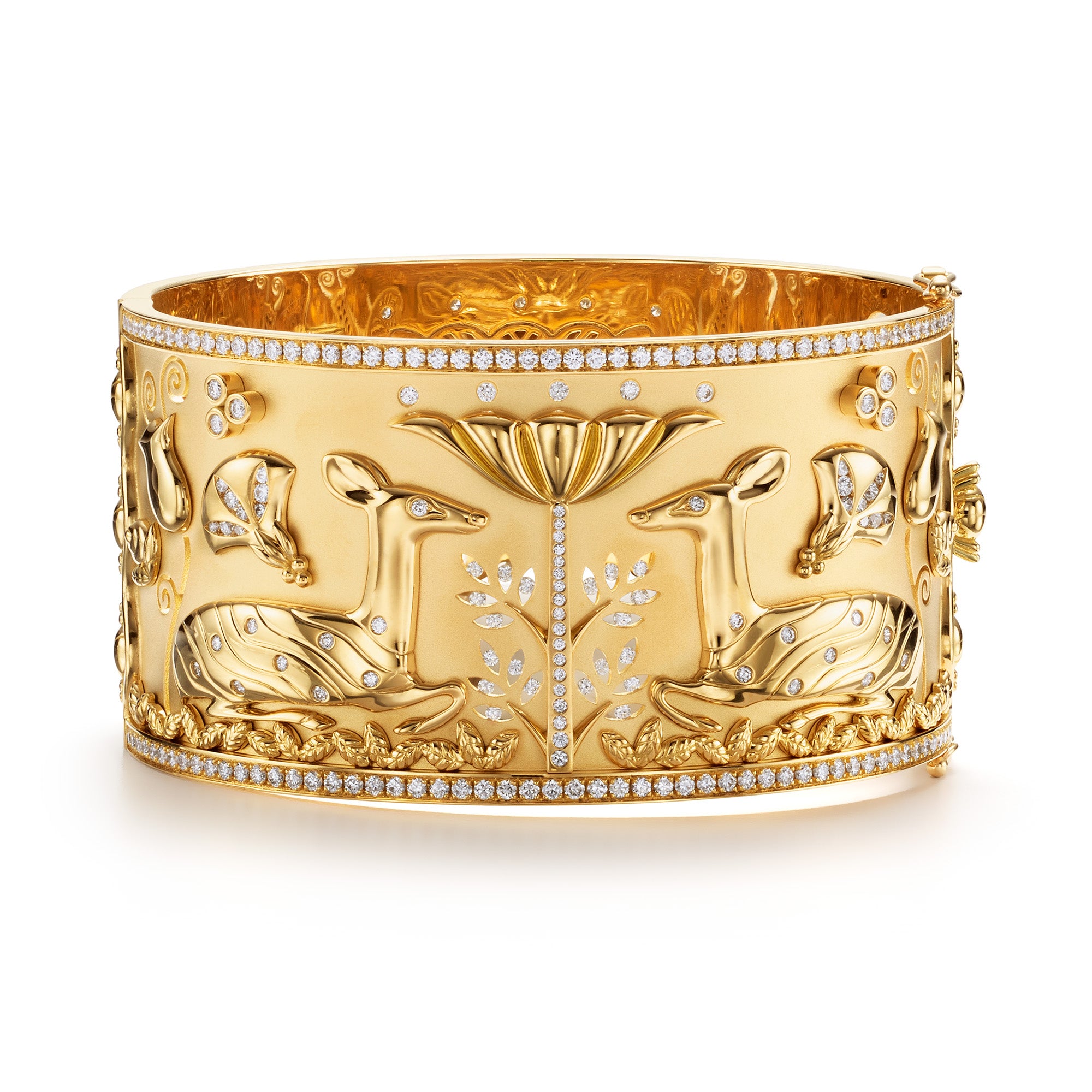 A limited edition piece from the Tree of Life Collection, the 18K Deer Bracelet references a meditative, Buddhist garden. Two deer, with legs gracefully bent, rest on a bed of chiseled leaves. Pavé diamond accenting gives the deer a sparkling liveliness. Gold and diamond flowers in full bloom bring their own sweet energy to the scene.