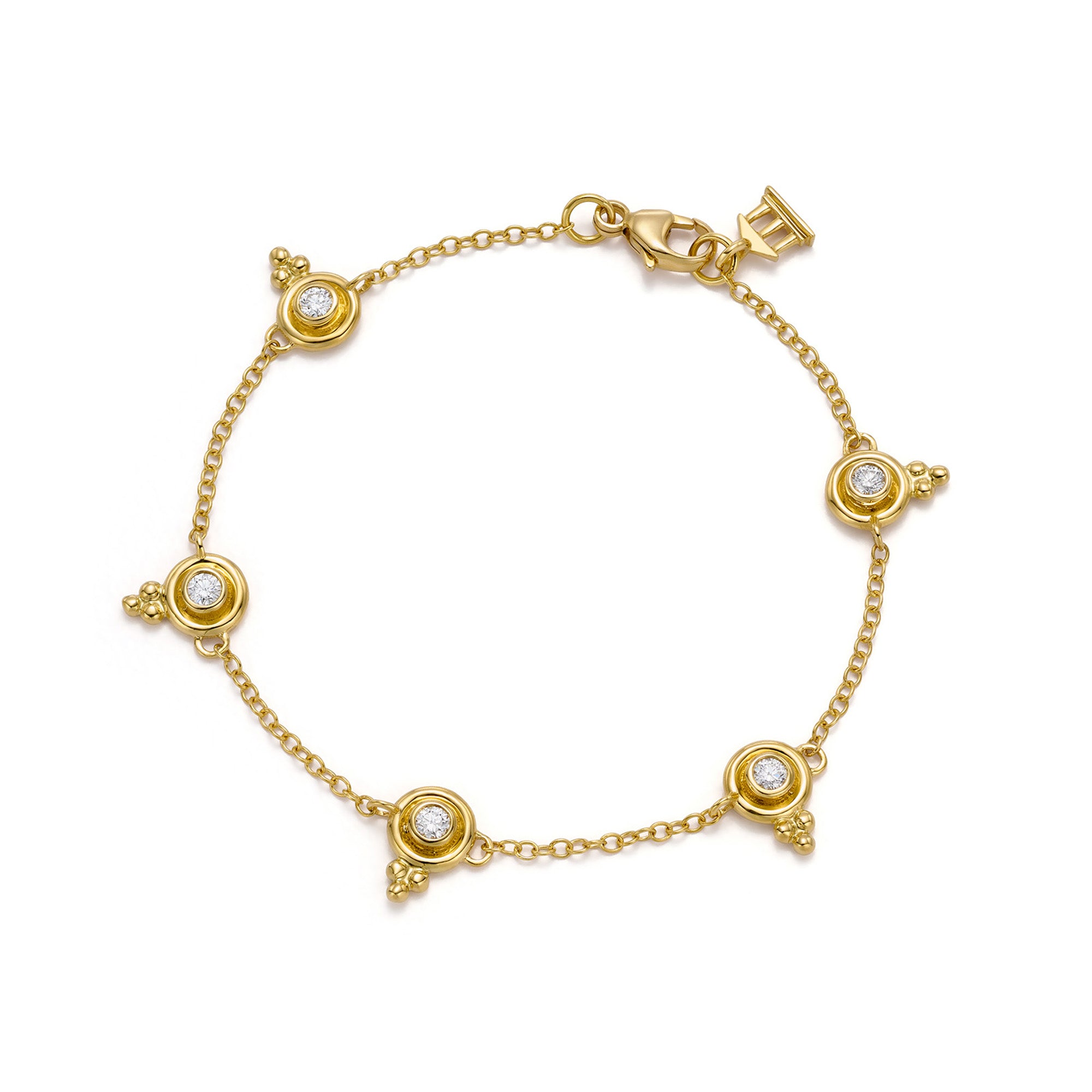 The 18K Five Diamond Temple Bracelet finds a collection of diamonds set in our signature yellow gold. It is finished with our iconic Temple Charm.