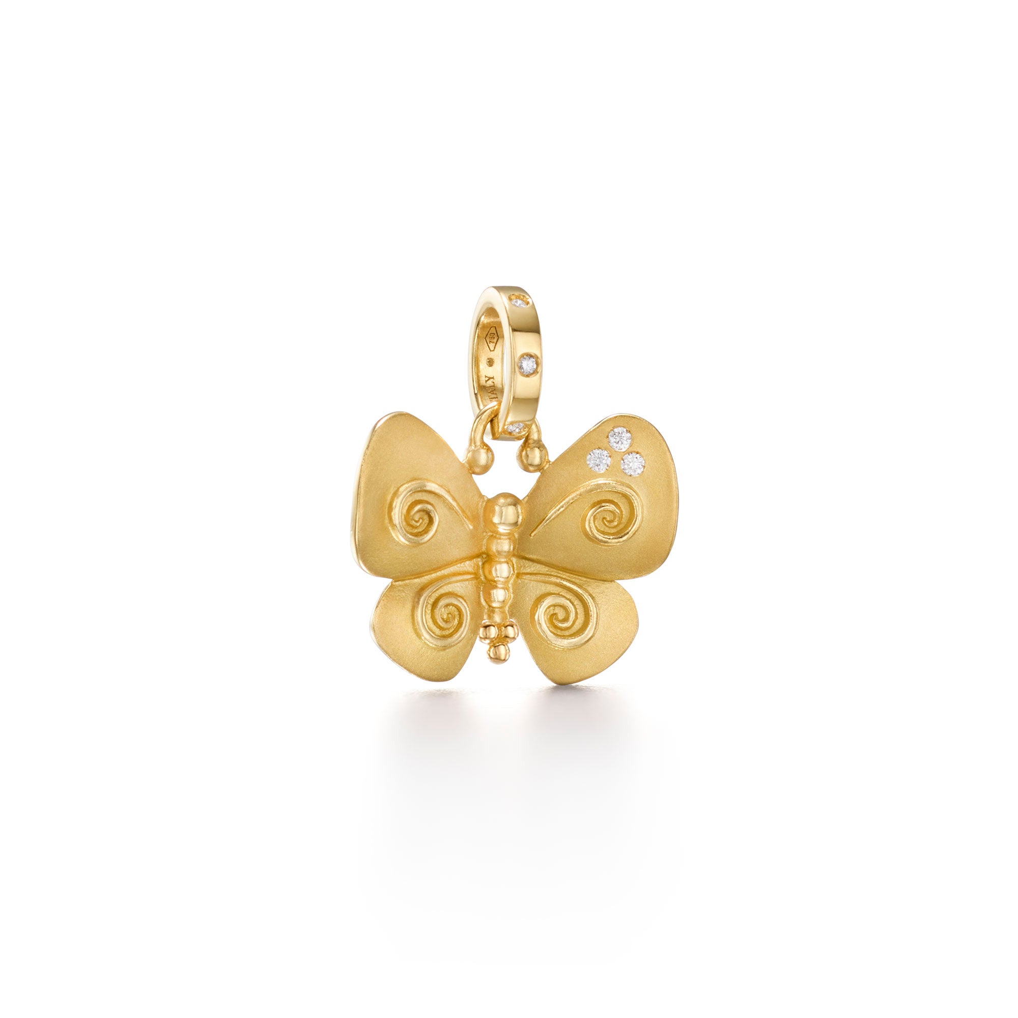 On the 18K Golden Butterfly Pendant, our signature yellow gold has been skillfully crafted to evoke the beauty of nature. Both the bale and a single butterfly wing are accented with diamonds.