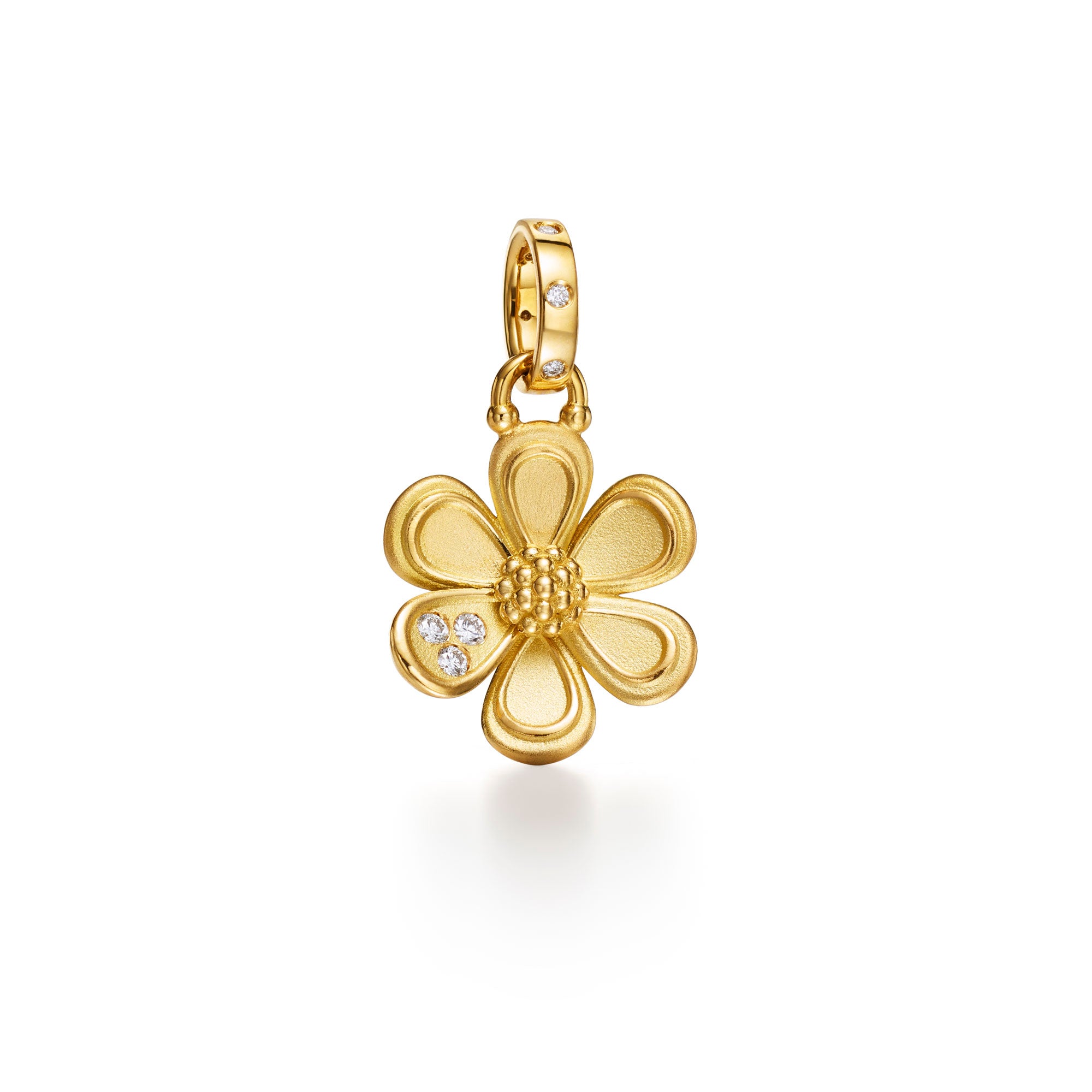 On the 18K Golden Flower Pendant, our signature yellow gold has been elegantly crafted into the shape of an open blossom. This pendant is accented with a trio of diamonds.