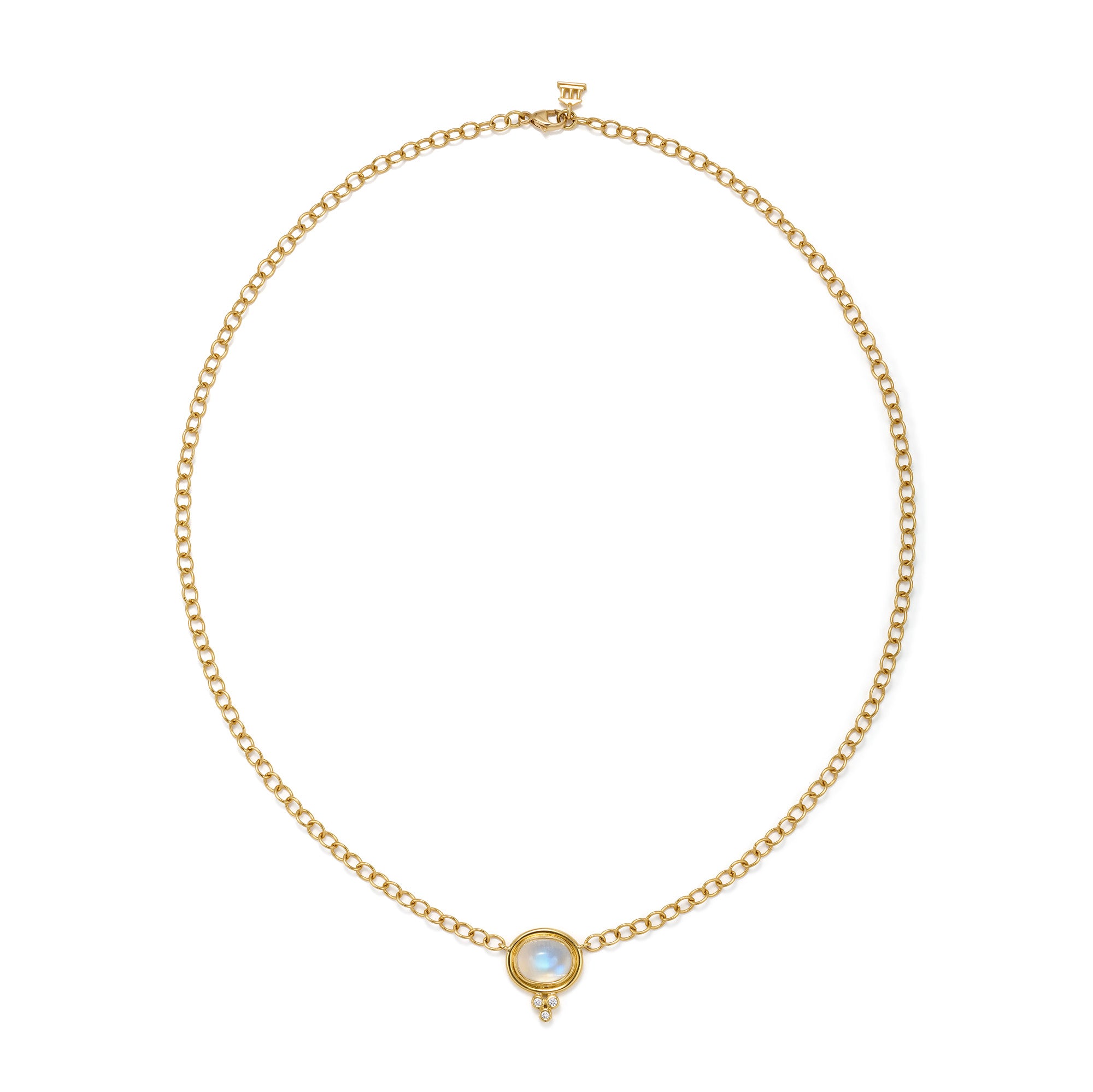 On the 18K Lucrezia Necklace, our signature stone, the luminous Blue Moonstone, shines brightly on a chain made from our iconic yellow gold. This necklace has two possible lengths and is finished with our signature Temple charm.