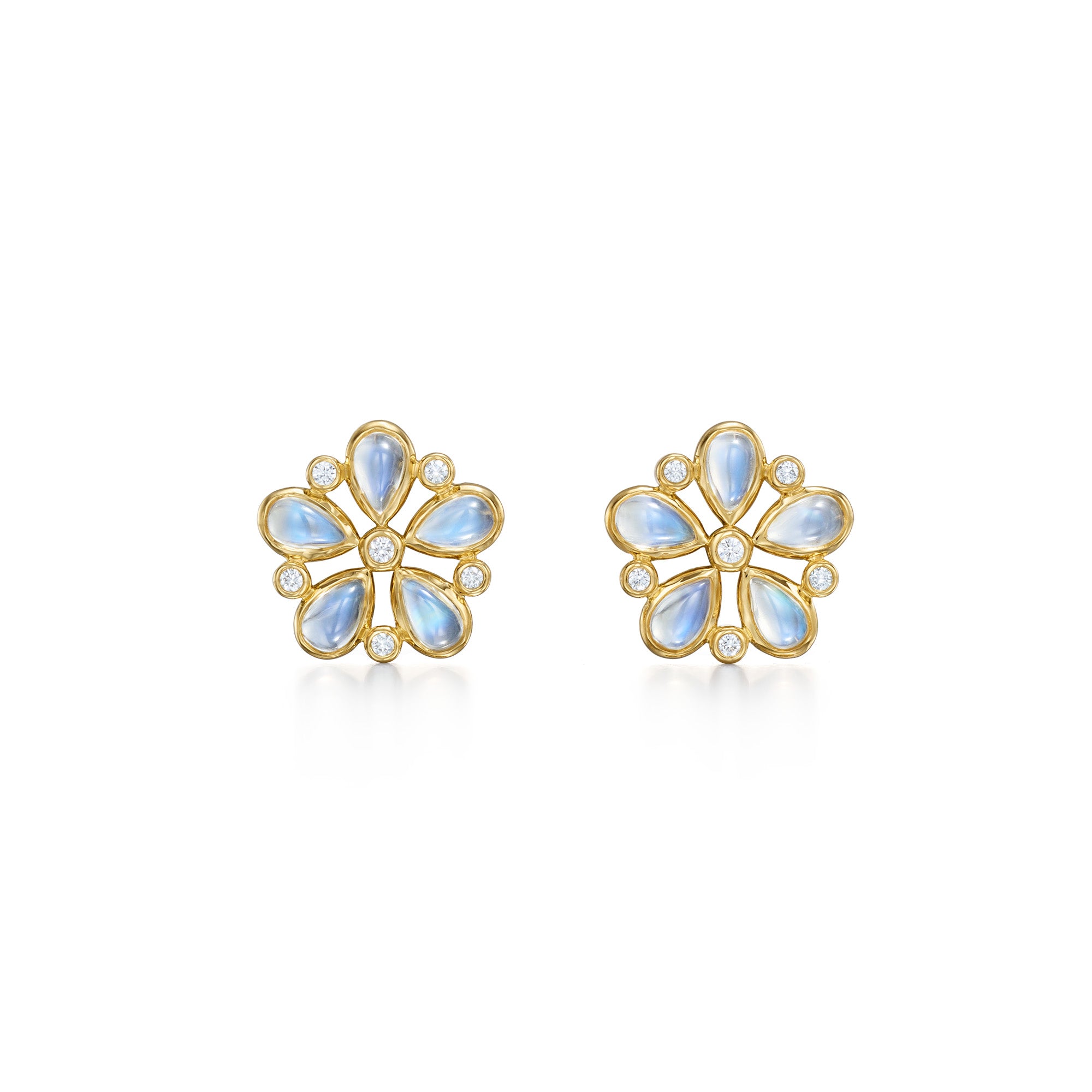 The 18K Luna Flower Post Earrings find our signature gem, the luminous Blue Moonstone, arranged into the shape of an open blossom. These earrings are accented with diamonds.
