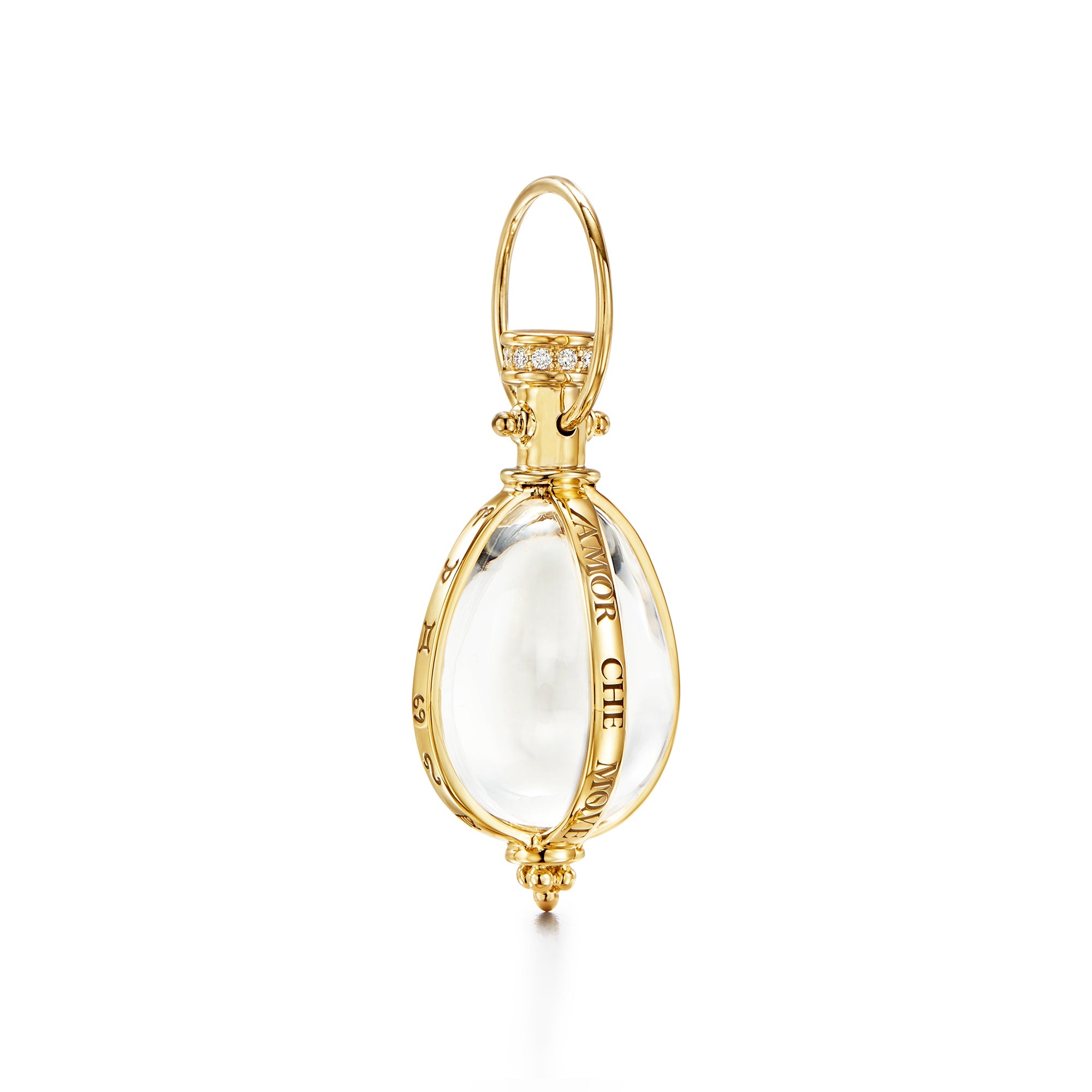 The 18K Medium Astrid Amulet is one of the brightest stars in the Celestial Collection. Golden bands engraved with symbols representing the planets and zodiacs orbit a finely polished, egg-shaped, rock crystal. The inscription–– Amor Che Move Il Sole E L’Altre Stelle (the love that moves the sun and other stars)— the last verse from Dante Alighieri’s epic 14th century poem, The Divine Comedy, adds a lyricism that is both meaningful and elegant. Available in three sizes, this amulet draws inspiration from the invisible forces that guide the universe.