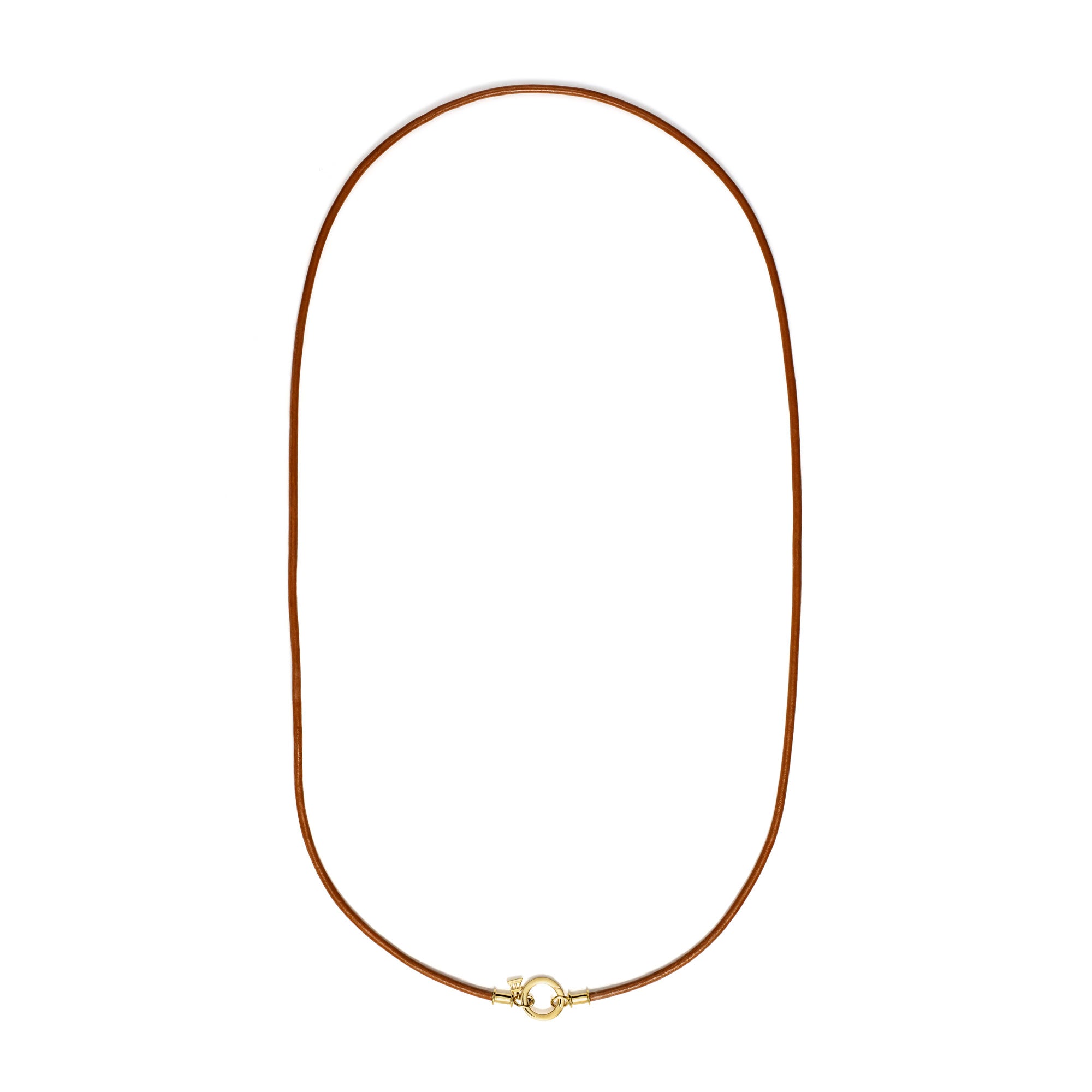The 18K Open Bale Natural Leather Cord is fashioned from naturally dyed leather and is finished with a gold bale.