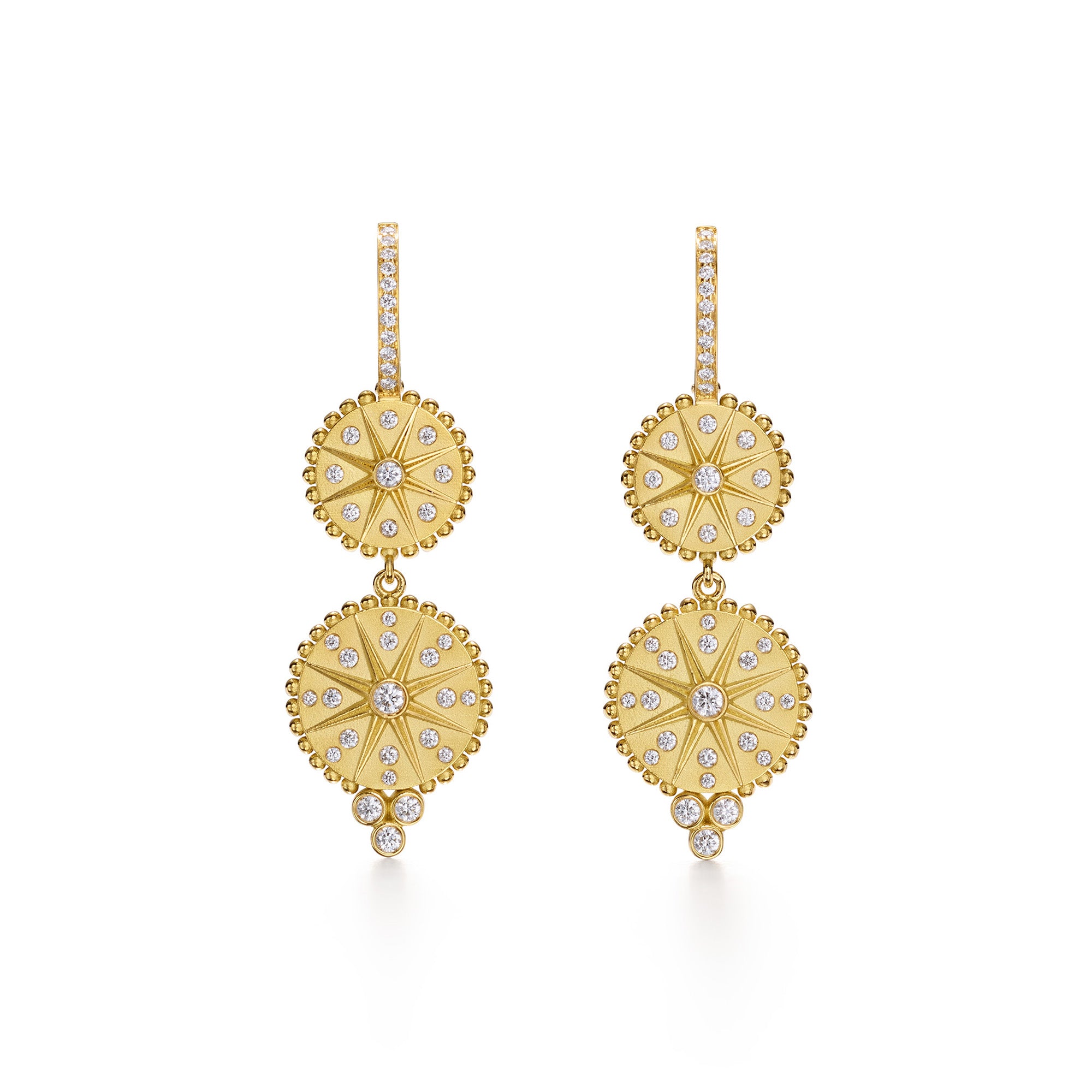 The 18K Orbit Star Drop Earrings render four luminous stars in diamonds and our signature yellow gold.