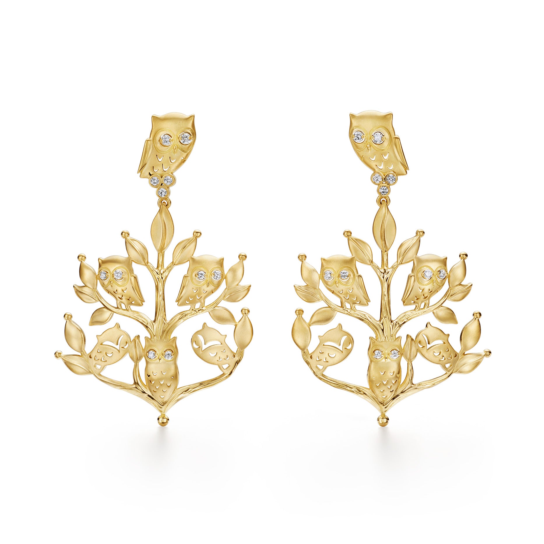 The 18K Owlwood Earrings feature a golden parliament perched among leafy branches—six owls nestled in a miniature grove. A tribute to quiet wisdom and the beauty of wild places.