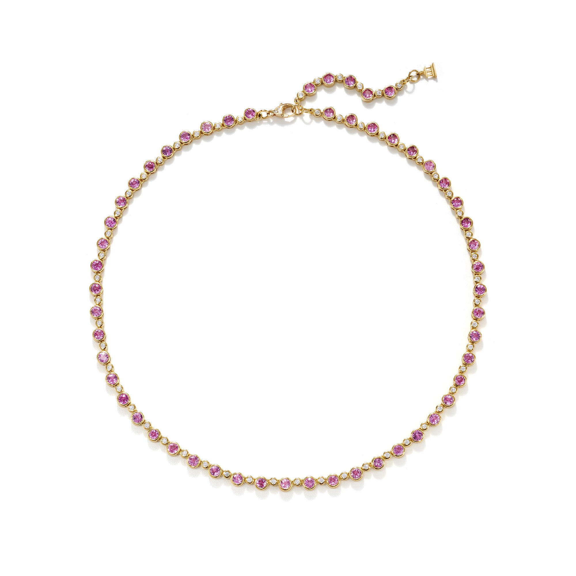 Pink Sapphires and brilliant diamonds lend their light to the 18K Pink Sapphire Eternity Necklace. This piece has two possible lengths and is finished with our signature Temple charm.