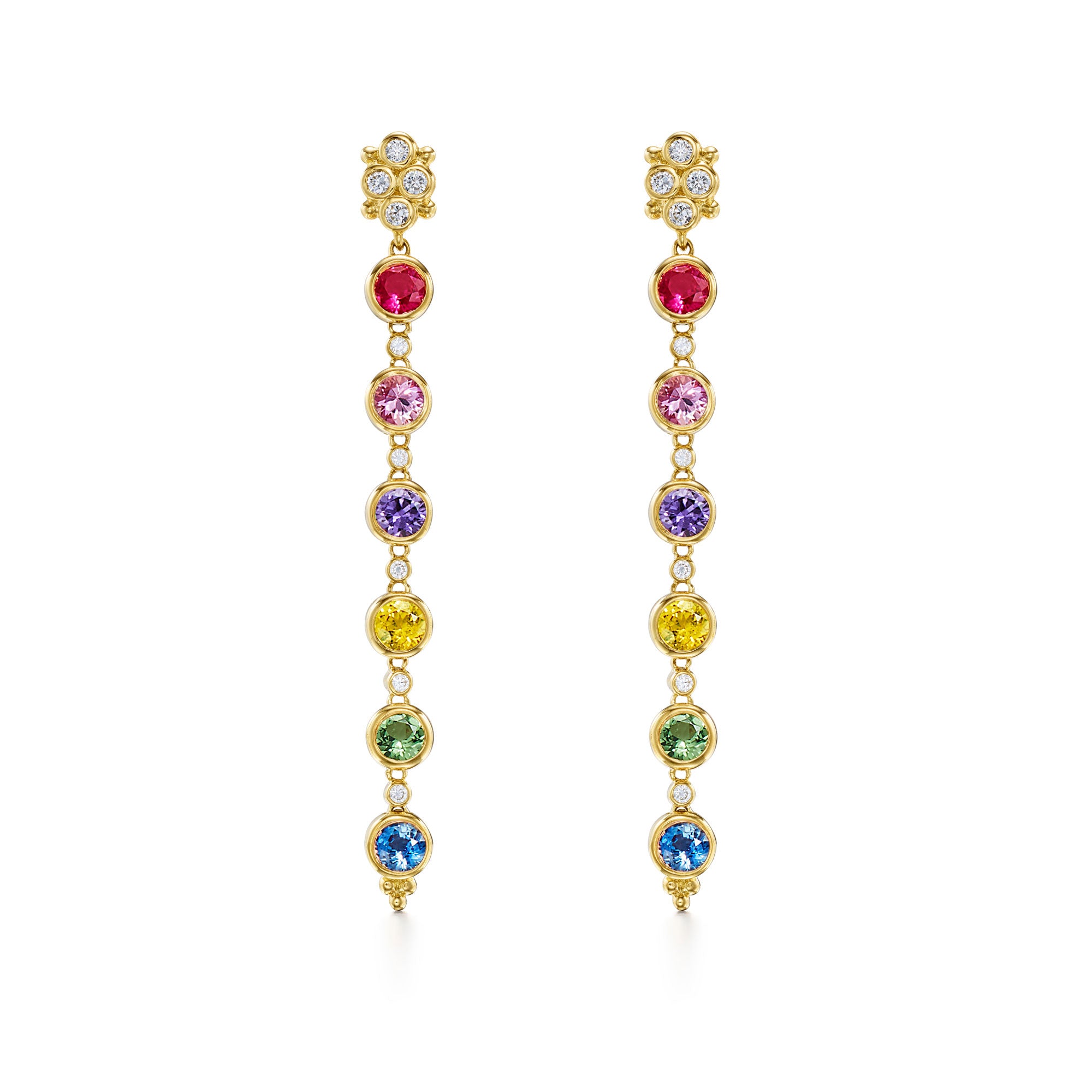 The 18K Rainbow Drop Earrings are composed of an expertly-matched selection of colored sapphires. They are accented with diamonds.