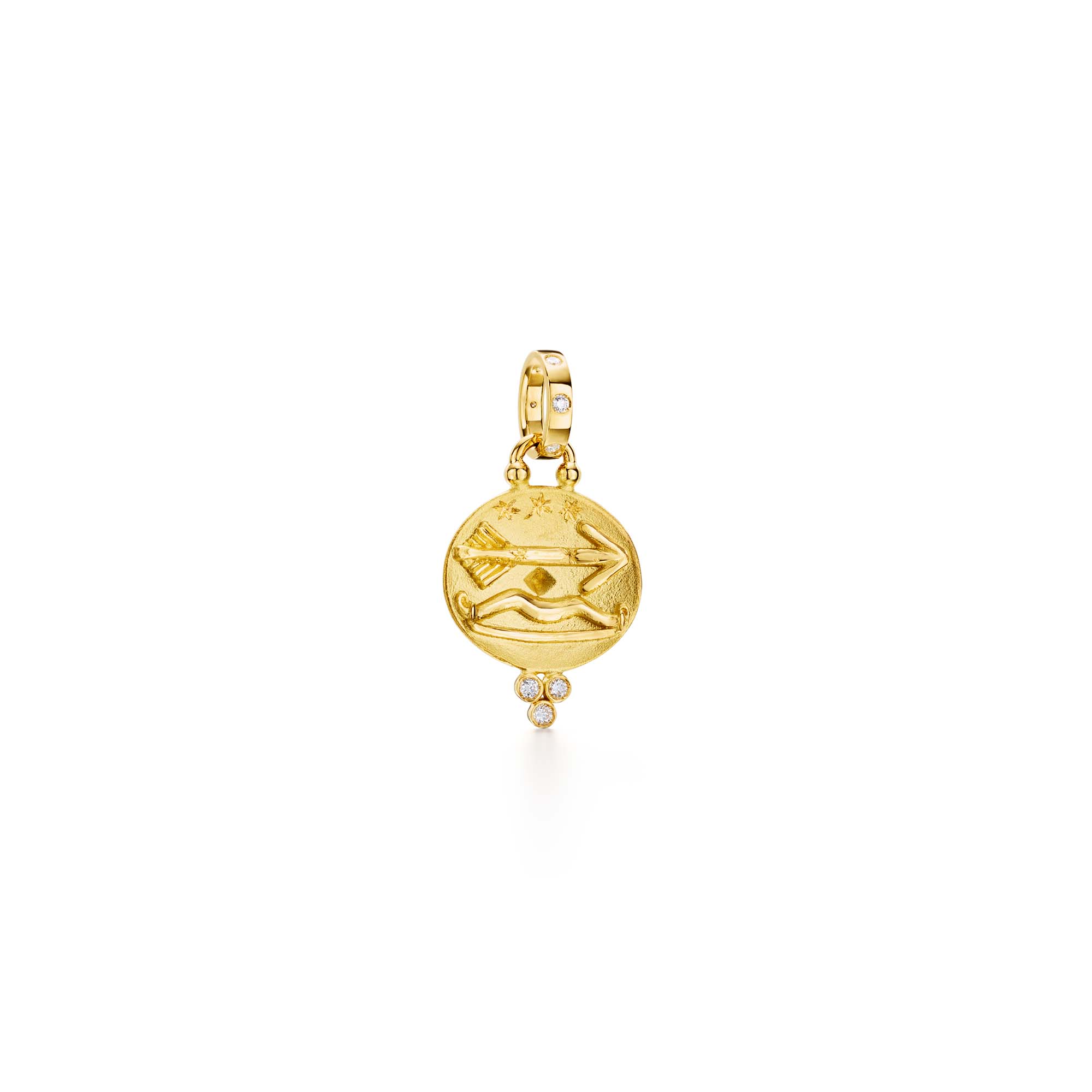 You were born under supernatural stars! A golden symbol of the honest, adventurous, and independent Sagittarius, channel your constellation with this pendant. Featuring your sign in golden relief on the front, and finished off with our signature diamond trio.