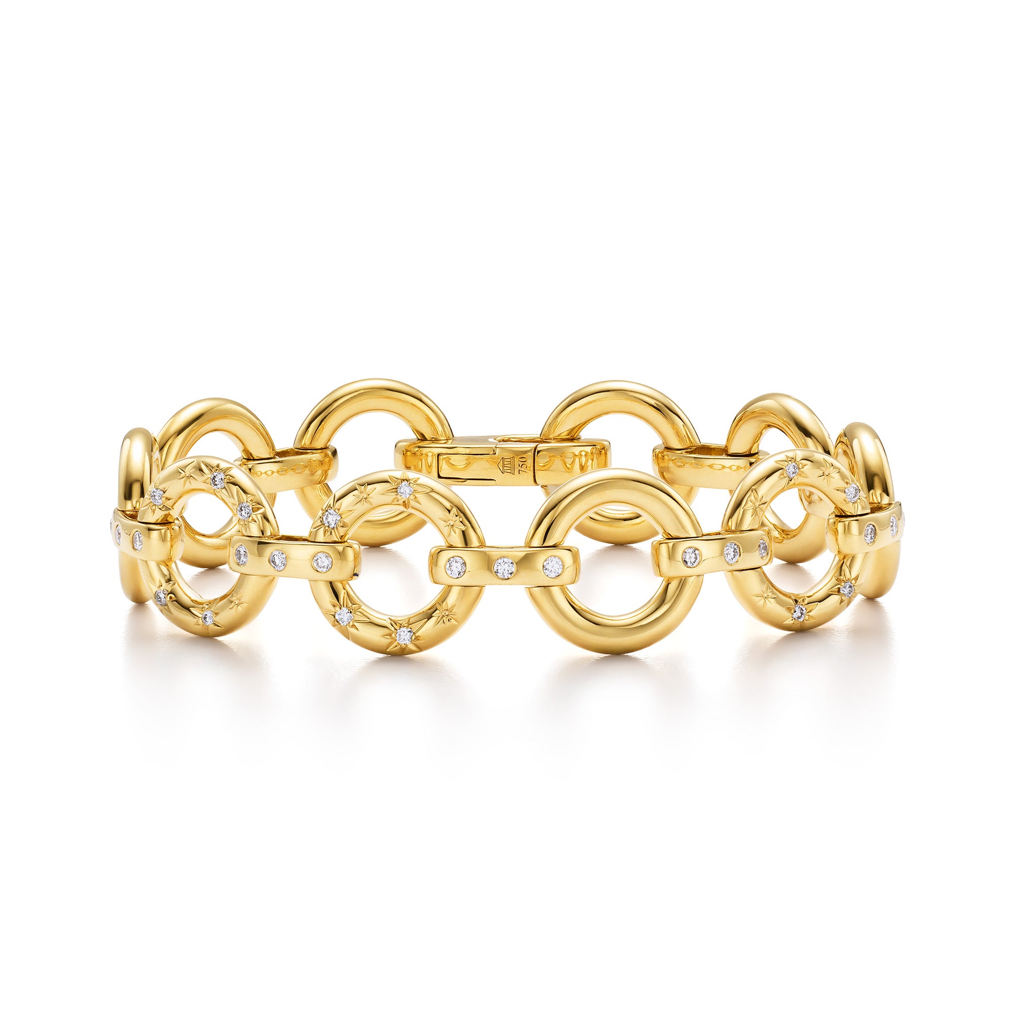Inspired by the intricate chainmail Jean d’Arc wore to battle, the 18K Small Jean d’Arc Bracelet is composed of rounded links that lay against the body. It is fashioned from our signature yellow gold and touched with diamonds.