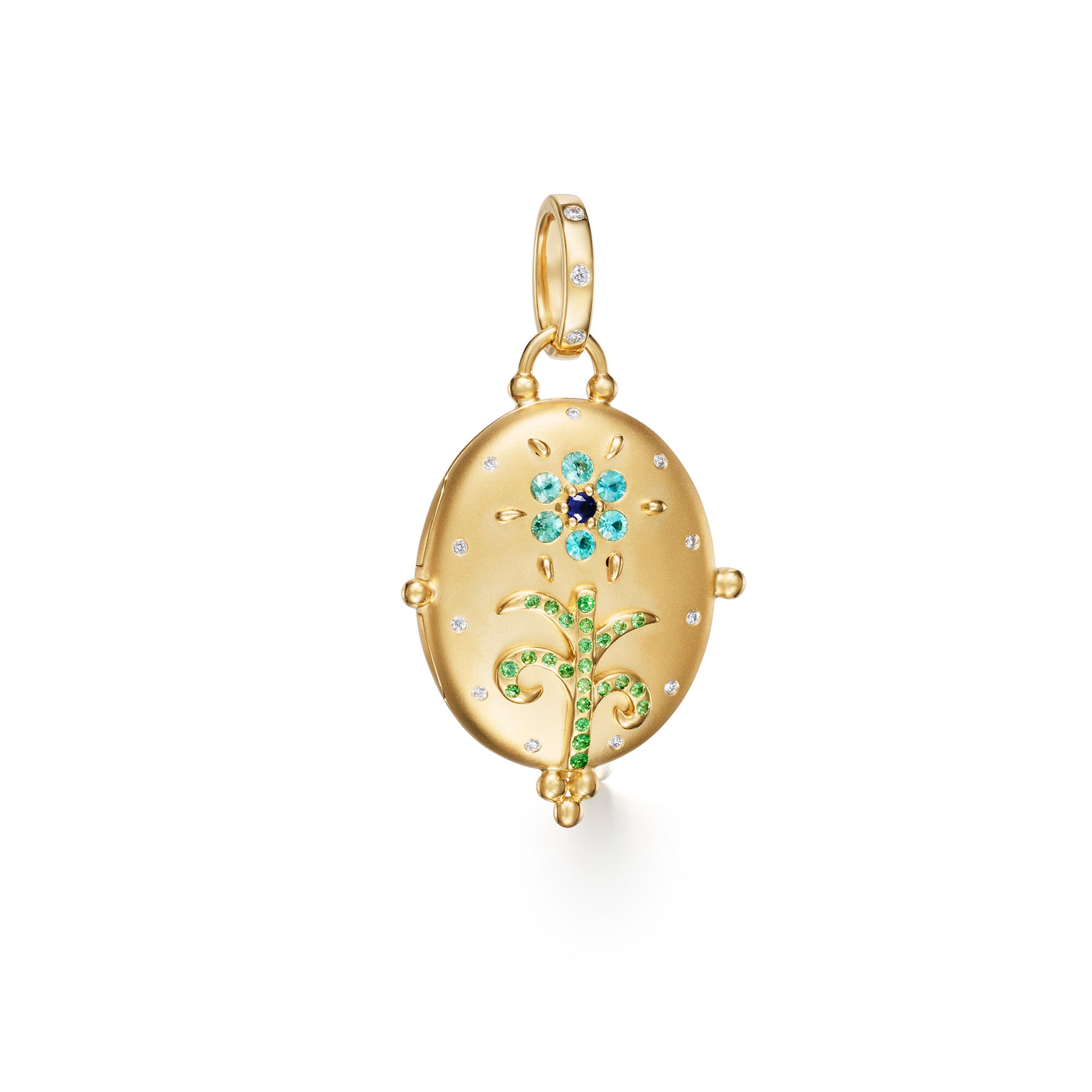 In keeping with the tradtion of sentimental jewels, we introduce our small 18K Small Paraiba Primavera Locket featuring a delicate stem set with brilliant green tsavorite garnets topped by a blossom of faceted paraiba tourmaline. Make it personal and inquire about our expert engraving options. This locket provides a wonderful opportunity for personalization from initials, dates to commemorate an important event, or just your favorite personal message to yourself.