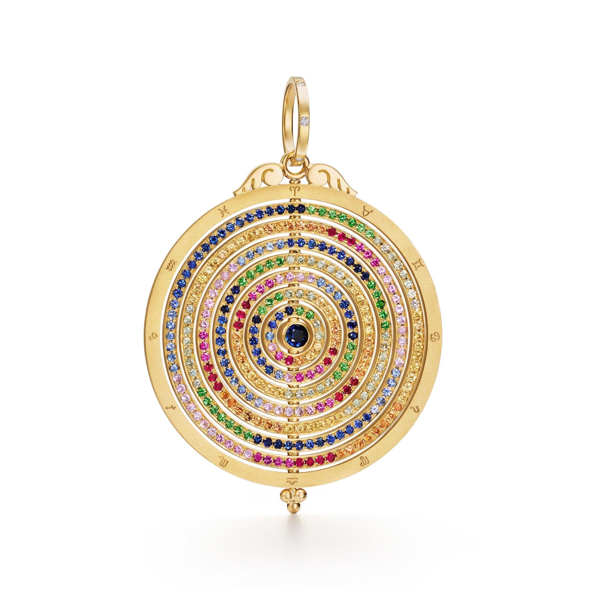 The Tolomeo Pendant is an 18 karat gold jeweled representation of the ptolemaic hypothesis, the two thousand year-old astronomical theory that earth was the center of the universe. Rings of multicolored sapphires represent the planetary orbits from the moon to saturn. In 2017, this piece became part of the permanent collection at Le Musée des Arts Décoratifs at the Louvre.